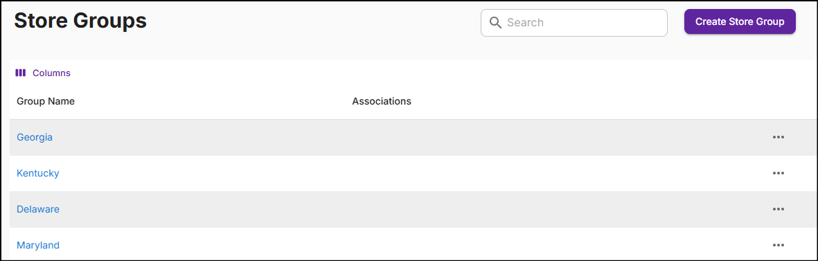 The Store Groups screen displays Group Name, Associations, and Ellipsis to edit and delete the store group.